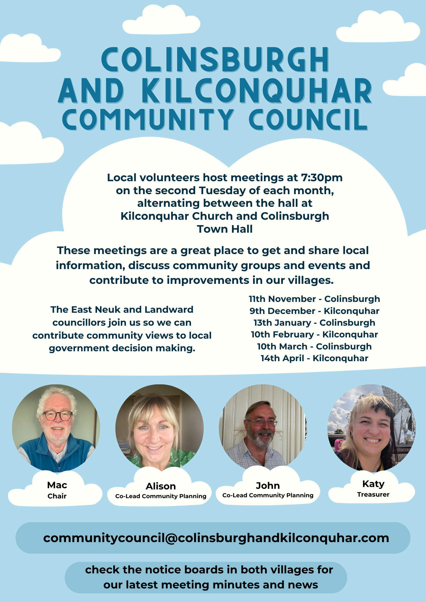 Colinsburgh and Kilconquhar Community Council is the link from residents to Fife Council. If you have anything you’d like to discuss with us, please feel free to join us at meetings on the second Tuesday of each month.